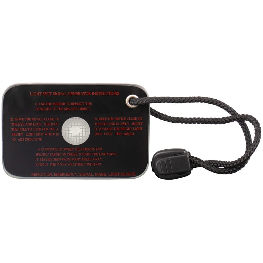 Our Signal Mirror was designed for one-hand operation. Its instructions are printed on the reverse side and will float in water.